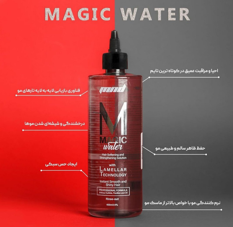 روش مصرف: ابتدا موها را با شامپو متناسب با نیاز موی خود بشویید، سپس مقدار کافی از محلول مجیک واتر را به ساقه موها زده و به خوبی ماساژ دهید. پس از چند دقیقه ، موها را با آب ولرم آبکشی نمایید.