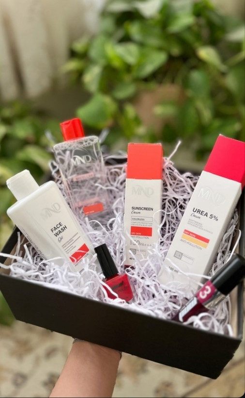حجمپک شامل: کرم دست اوره، ضد آفتاب، میسلار واتر، ژل شستشوی صورت، مرطوب کننده صورت، تینت لب، لاک، به همراه جعبه و پوشال